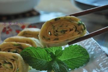 6、慢慢将饼子卷起,留下一小条边,再照做厚蛋烧的方法做卷饼;