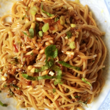 圆细挂面200克,小黄瓜丝30克,青椒丝30克,榨菜丝30克,豆芽30克,香菜2根,葱蒜适量,姜适量,花椒适量,酱油0.25小匙,醋,糖,麻油3大匙,花生酱1大匙,辣油1大匙