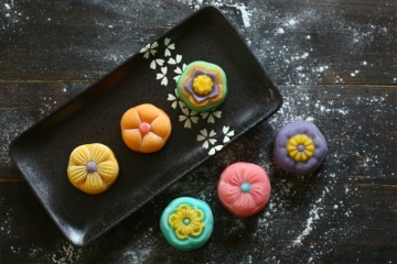 8.将月饼馅分割搓成25克/个的小球,将冰皮分成45克/个的小球,并分别用牙签沾一点食用色素搓揉成彩色冰皮