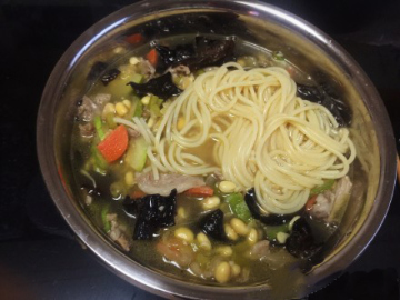 主料:草原羊肉200克,意大利面100克、胡萝卜一个、西葫芦少半个、木耳适量、黄豆少量