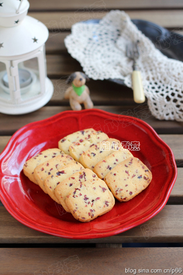 1.原料::低筋面粉115克,鸡蛋液15ml,黄油75克,糖粉60克,蔓越莓干35克。 烘焙:165度,中层,约20分钟,至表面微金黄色。