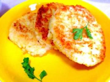 4、待炒好的米饭稍凉后,便可做成米饼,入加了油的平底锅小火煎,煎至两面金黄即可。(一定要等一面煎定型后才翻面,不然容易散)煎好的米饼趁热吃非常香。(可以用厨房纸吸去多余的油,更健康)