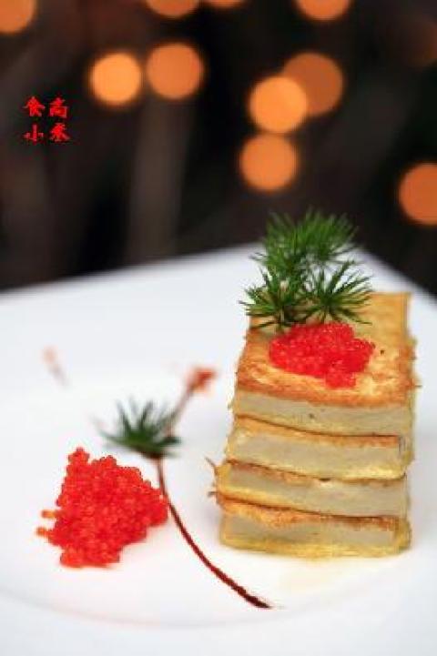 3.全部煎好后,就做调味汁,肉糜、马蹄(荸荠)丁、红椒丁还有香菇丁,将所有的丁放到锅里炒,加水和盐,有高汤更好,最后把豆腐放入,让豆腐吸饱汤汁盛出,这样豆腐会入味些,最好在留些汤汁连同那些菜末一起浇在上面即可。