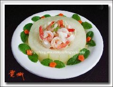 4.另起锅,放一匙素油,把虾仁下锅炒转,虾成熟色马上推入百合,盐调味,烹入一小匙料酒即起锅,盛在冬瓜圈内,撒上葱花即可.