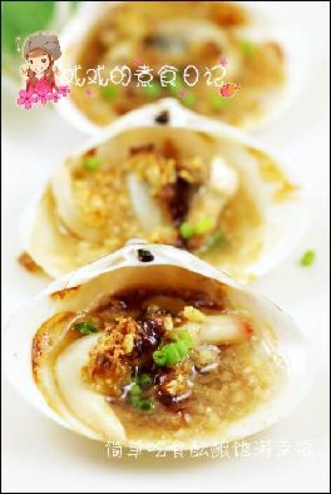 3、蚌壳熟后自然会打开,拿出贵妃蚌,撒上葱花、姜末和蒜蓉,再瓢上滚油,最后淋上鲜抽。哇~~绝对鲜嫩可口啊!