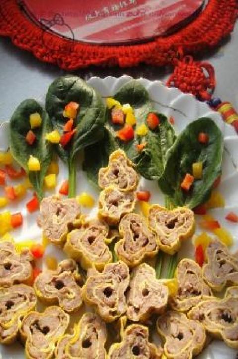 3.13、轻轻将蛋饼卷好,注意不要太用力,否则蛋饼会破哦14、将蛋饼竖起后轻轻捏紧。15、蛋饼放在案板上,用准备好的三根竹签固定,长度一边比蛋饼多出三四厘米就好。16、蛋饼全部卷好后入蒸锅大火蒸制二十分钟。17、蒸好后的蛋饼彻底放凉后,切薄片。这便是灿烂家乡的家常年菜----卷煎。18、将卷煎片摆盘,灿烂那焯水后的菠菜颜色暗些了,放置时间太久了,菠菜算是摇钱树之树干,盘边用黄红彩椒装饰,喻意大年的烟花。卷煎片便是挂在树上的铜钱也,哈哈,这铜钱也变身成花形啦
