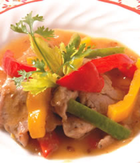 2.取一平锅,以小火用奶油炒香洋葱块,加入里肌肉煎炒4分钟后,倒入白酒煮5分钟,再加入蜜桃酱汁、三色甜椒块略拌煮1分钟待收汁即可。