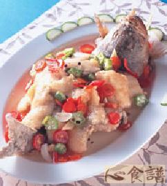 鲈鱼一尾,花椒10粒,干辣椒10公克,葱段1支,地瓜粉60公克,a.葱姜水1/2杯,b.酸甜糖醋汁1/2杯