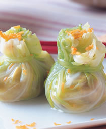 3.将作法2的材料包入高丽菜中捲成菜捲后,利用芹菜稍加綑绑,一起放入蒸锅中以中大火蒸约6分钟取出。