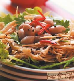 牛蒡300公克,花生200公克,辣椒5公克,香菜3公克,莴苣少许,牛蒡:香油6㏄,白醋15㏄,盐4公克,糖4公克,花生:盐8公克,糖8公克,八角8公克,白胡椒3公克,素蚝油15公克,香油12㏄,水1000㏄