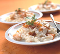 (3)另起油锅放入少许水及海鲜火锅高汤粉煮开,即可以太白粉水勾芡,最后加入烧竹轮、蟹管肉、红萝卜碎及蛋白一起拌炒至熟透即可。