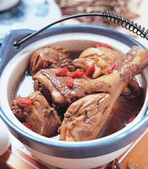 3.)将仙草汁、枸杞也放入陶盅里,一起炖煮约1~2个小时,等鸡肉完全熟透并入味,最后再加入调味料即可上桌食用。