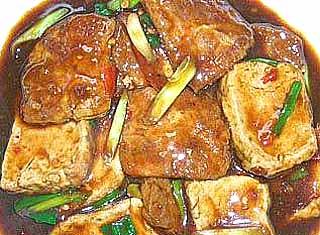 3、将炒锅置武火上烧热,加入素油,烧至六成热时,用筷子将豆腐放入油锅,逐块炸成金黄色,捞起沥干油分备用,锅内留底油60克,重置武火上烧热加入姜、葱、豆腐、盐、味精、酱油、白糖、大蒜、汤汁少许,炒熟,加入核桃仁稍炒即成。