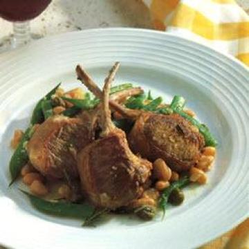 羊肉清汤、清鸡汤或高汤150毫升,小的嫩菜豆150克,盐、黑胡椒适量,橄榄油1汤匙,黄油3汤匙,柠檬1个,迷迭香2枝,羊排或羊腰肉(羊柳)8块,每块约重100克,中等大小洋葱1个,罐装利玛豆2罐×300克,大蒜2瓣,无甜味白葡萄酒300毫升,稠奶油3汤匙,续随子2汤匙