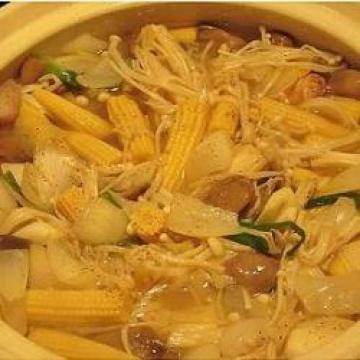3.快火下油起锅,爆香蒜蓉,姜,红葱头,青葱,先炒香洋葱,再炒冬菇,玉米笋及其它干的菇类炒软。加入草菇略炒,将所有材料沥水放入沙锅中,再加金针菇煮10分钟。
