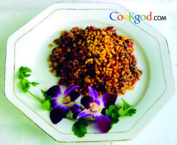 乳鸽2只,干小麦麦仁200克,红椒15克,芹菜20克,炸好的松仁10克,生粉5克。调料盐5克,味精3克,胡椒粉3克,葱5克,色拉油500克。