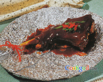 2、调料调好汤汁,将山羊腿卤制成熟,改刀装盘,汤汁勾芡淋在羊腿上。