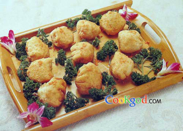 3、面粉和匀,分成小面团。荷叶切成小片,包入乳鸽,再用面团包起,入五成热油中炸至表皮呈金黄色,起锅装盘即成。