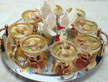 3、将乳鸽放入调好味的浓汤中,上屉蒸至熟软即可。
