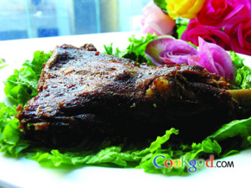 1、羊后腿冲洗30分钟至无血水,用铁钎子在羊腿的上扎一些眼,入盆中加料酒、干海椒、花椒、十三香、盐腌渍5小时。2、锅入清水加羊肉小火烧开后煮约5分钟捞出控水;锅入四川卤水烧开,入羊腿小火卤2.5小时后捞出控水。3、锅入色拉油烧七成热,入羊腿中火炸约2分钟,捞出入盘中,刷葱油,用胡萝卜花、香菜点缀,将葱丝、黄瓜条、孜然粉、豉香复合酱分别装入小碟里跟羊腿一起上桌即可。