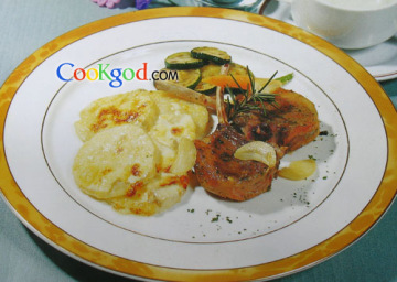 2、土豆切片,加盐、胡椒、蒜泥、奶油,放入�炉内�熟。