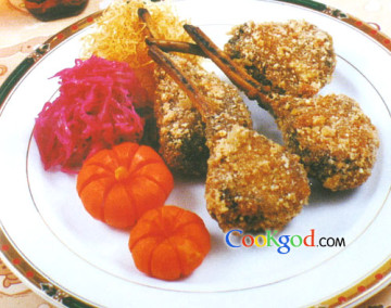 1、将羊排用盐、胡椒粉、俄力冈、圆葱碎、西芹碎腌制入味后,醮面粉、拖蛋液、醮面包渣,做成棒锤形备用。