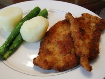 半杯面粉,加(1茶勺盐,1茶勺胡椒粉,一点点辣椒粉)混合;俩个鸡蛋打散;1杯面包屑