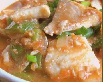 4. 锅里留余油,放入姜粒,蒜粒,一点葱爆香,再放入青椒块,洋葱粒炒香,加入2里的番茄,番茄酱(ketchup),糖,白醋,白胡椒粉,盐和少量的水,煮开后放入鱼片,翻炒几下,撒上葱花就可以出锅了。