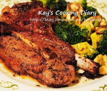 5、迅速把沥干的西兰花和蘑菇倒入锅中,加一点盐和黑胡椒粉,用羊排煎出来的油和肉汁迅速翻炒几下就出锅盛盘。(我还加了一点a1的steak sauce,吃起来就更像在餐厅吃的了,哈哈)