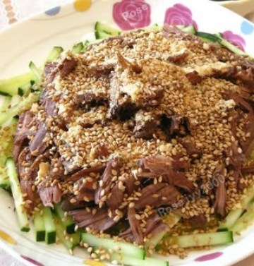 成品:面上铺炒过的花生碎和撒些炒过的芝麻,浇上调好的汁儿或用碟子盛汁等吃时按自己的需要量浇,即可。