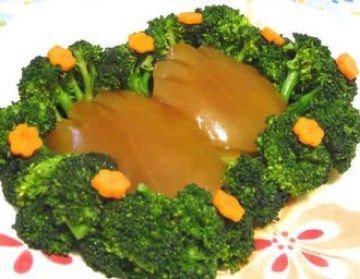 七、然后倒扣在另一碟子上,肉向下。然后用焯熟的西兰花围住熊掌;