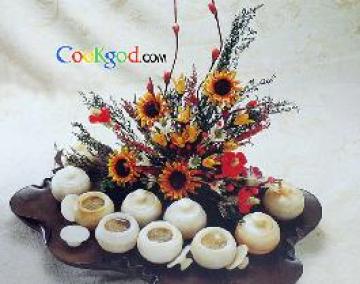 3、羊肚菌、鸡枞菌、冷菌、松茸洗净,置入小石盅内,加龙筋、驼鸟筋、鹿筋,浇入鸡汤,上笼蒸制20分钟,装盘,点缀盘饰即成。
