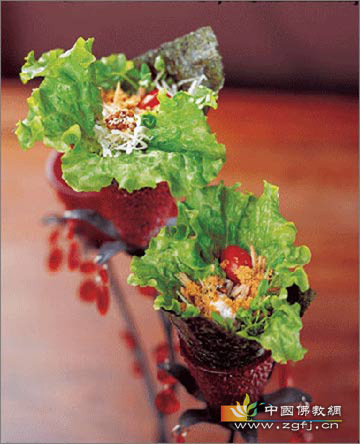 2.用奶油生菜叶把生菜丝、鲜豆芽、素火腿丝卷起来,再放上核桃仁和圣女果。