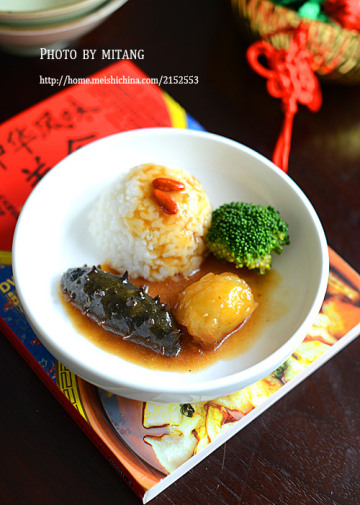 10 取米饭,将海参鸽蛋围其周围,放上焯水的西兰花,将锅中的汤汁勾芡浇在海参鸽蛋和米饭上即可小窍门: