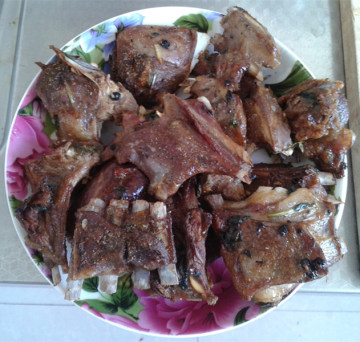 2.取出沥干抹上孜然粉.220度烤35分钟左右.中途要翻面.放烤架上,放烤盘烤出来会比较湿.看你的喜好而定.如果太老的羊排先煎再烤.咬不动别找我.