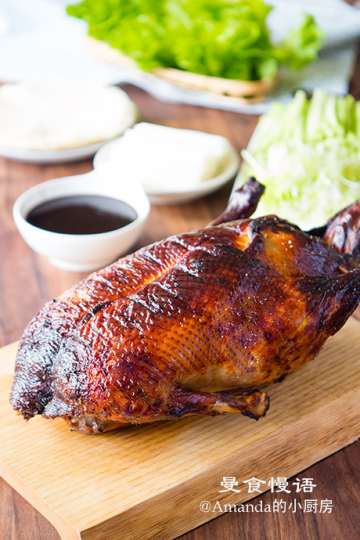 12、烤好的鸭休息至少15分钟后切片,配黄瓜条、葱丝、荷叶饼和甜面酱一起上桌