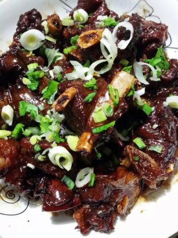 6、等羊排差不多熟的时候,加糖大火收汁,装盘,撒上大蒜叶碎即可享用!