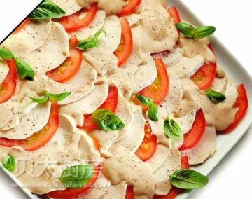 4、将番茄片和鸡肉片交错的摆在盘子中,再淋入金枪鱼调味汁。
