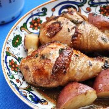 5.烤箱预热至170ºc。将烤盘放入烤箱,烤40分钟,翻转鸡腿,再烤20分钟,或烤至鸡肉很容易从骨头上分离即成。