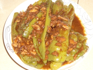 尖椒,肉碎,葱,姜,花椒粉,醋,白糖,鸡蛋,酱油,盐,黄酒,水,油