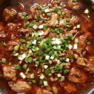 豆鼓半袋剁几哈、排骨750克宰成小节、洋葱半个切小块、干辣椒2个切节、老抽、生抽、料酒、白糖、花椒、郫县豆瓣剁细、老姜末、苦瓜500克、葱花