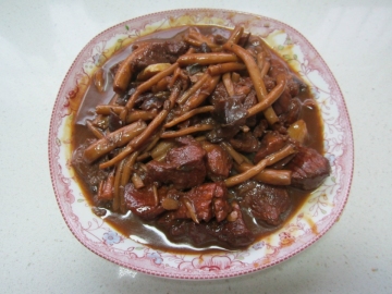5.放入茶树菇,拌匀后继续加盖焖炖1小时,直到茶树菇软烂。肉块酥烂时,转成大火将剩余汤汁收干即可。