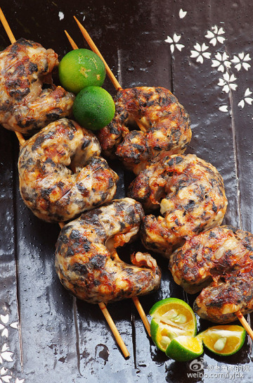 9、把马蹄状的猪肉油卷用竹签每三个一组串联起来,成竹蔗状。