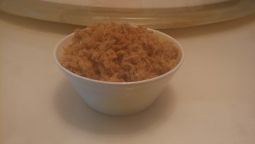 1,放入微波炉的容器一定要大,不然素肉松会转出碗外。