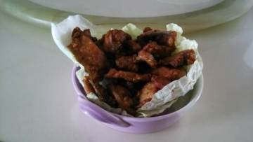 (3)将油锅加热,约8分热后,再将小排骨一一放入油中,用中火炸至金黄色熟透后,再改大火炸出油后,捞起备用。