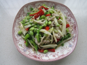 第五种:家常菜菜谱茭白辣椒毛豆肉丝做法