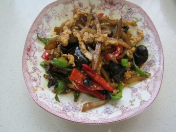 4、青红椒有点软时,倒入肉丝,放盐和鸡精调味,收汤即可。