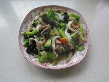 西兰花200克,平菇100克,肉丝100克,胡萝卜、木耳少许,油、淀粉、葱姜、料酒、盐、味精适量。