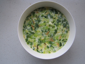 2、大碗内放青菜、鸡蛋、葱花、油、盐、鸡精充分搅拌。