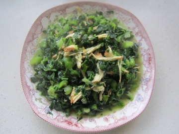 青菜300克,熟鸡肉100克,油、盐、鸡精适量。